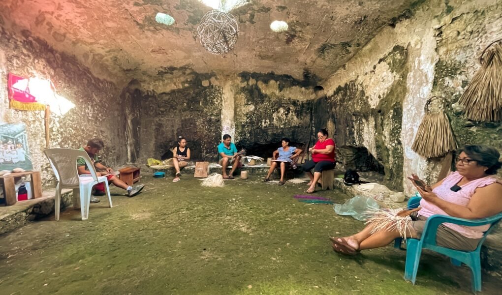 Quiero resaltar a la cueva como un elemento de gran relevancia, primero porque es una innovación comunitaria para tratar los materiales, pues aprovechando la humedad natural de la cueva, las palmas se ablandan y permite un tejido fino; segundo, porque se trata de la reproducción de un mundo, es decir, para resolver un problema o lograr una adaptación, el pueblo maya va a sus saberes, su ancestralidad y obtiene respuestas.