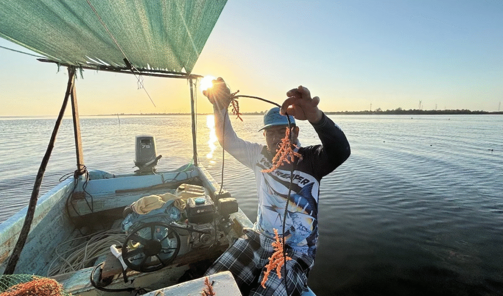 “La pesca ya ha escaseado mucho y con el cultivo de algas nos hemos dado cuenta de que es un trabajo tipo ‘de gota a gota’, trabajas todos los días de a poquito y tienes una ganancia segura. Ahora que viene la temporada de nortes pues uno no puede salir a pescar y en este caso, como está muy cerca de la playa podemos venir y trabajar un poco”, señaló David.